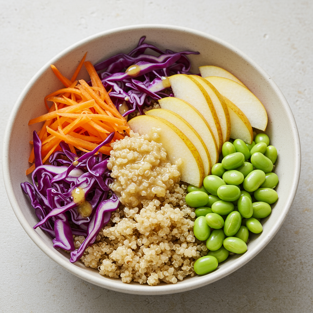 - Coloque la quinua, las verduras, el edamame y la pera en tazones.