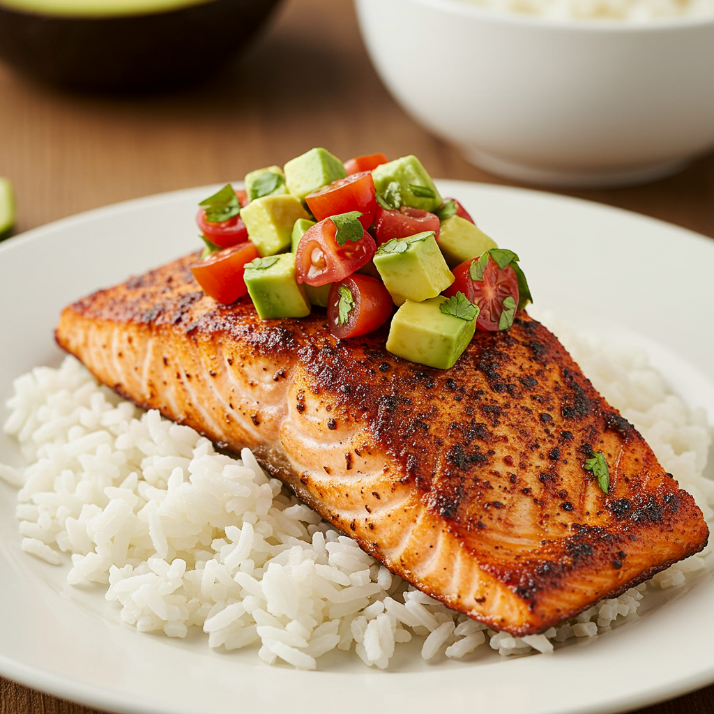 Un salmón ahumado picante acompañado de una refrescante salsa de aguacate.