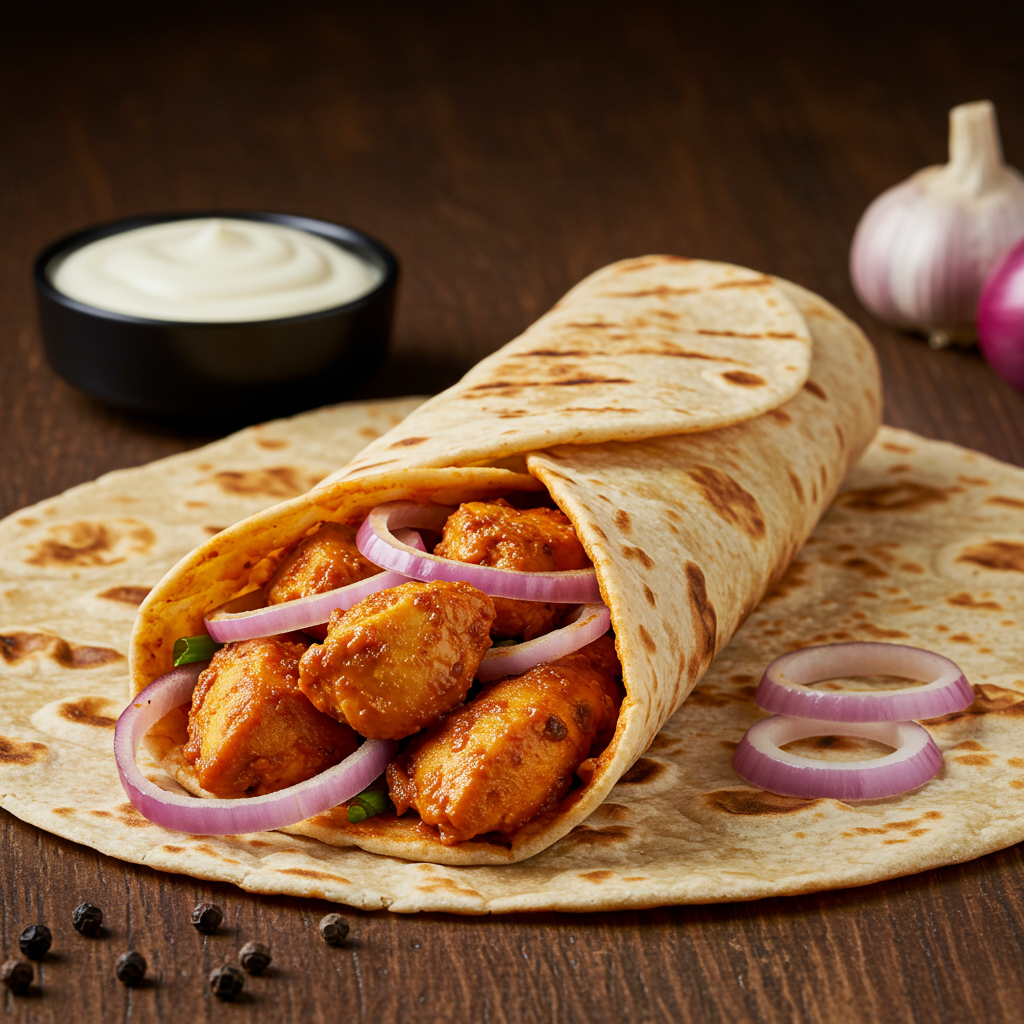 Mezcle todos los ingredientes de la marinada y cubra bien las tiras de pollo . Deje marinar durante al menos 15 minutos . Caliente una parrilla y cocine el pollo de 4 a 5 minutos por lado, mientras asa la cebolla . Unte la capa de chapati con mayonesa de ajo, lechuga, pollo asado y cebolla . Envuelva bien en papel aluminio cortado por la mitad y sirva .