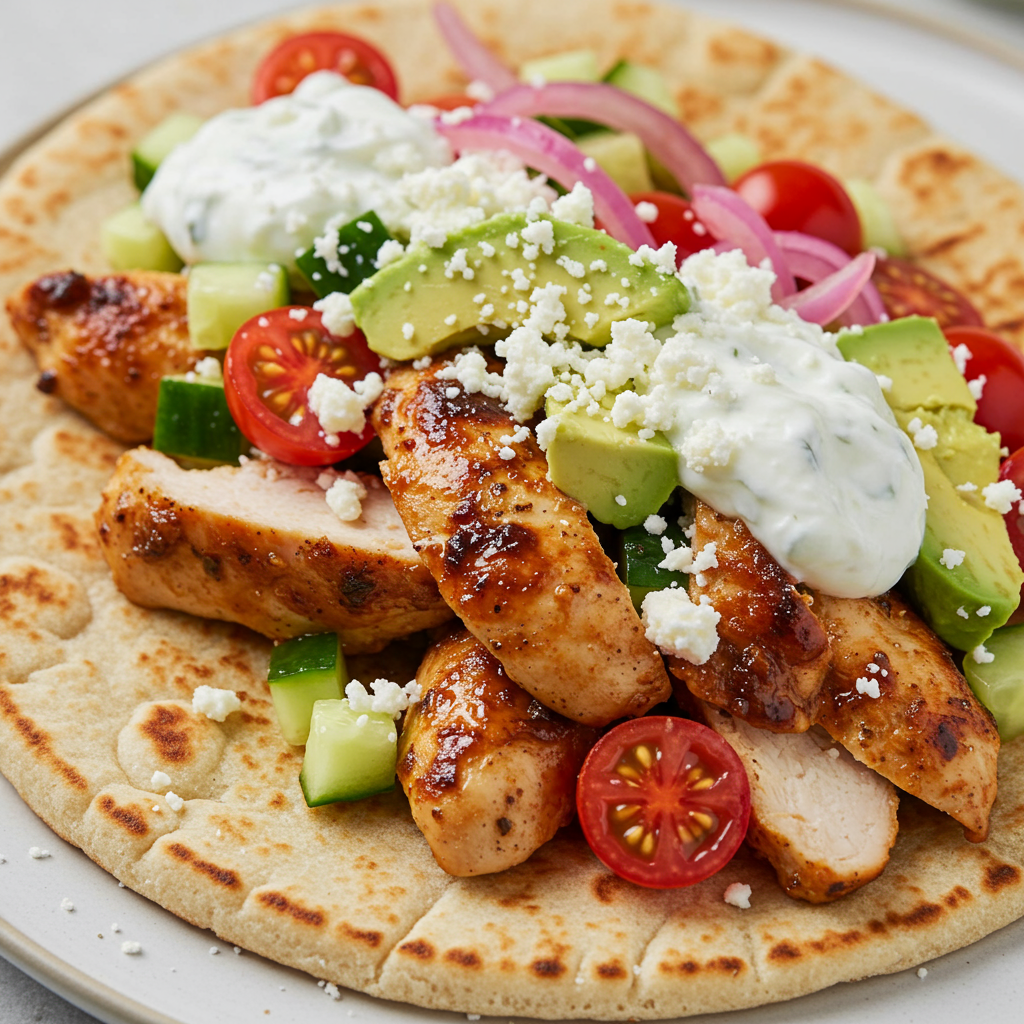 Precaliente la parrilla a 232 °C . Mezcle el pollo con aceite y todas las especias hasta que esté bien cubierto . Ase durante 10 minutos, voltee y cocine de 5 a 6 minutos hasta que la temperatura interna alcance los 74 °C . Deje reposar 10 minutos antes de cortar a contrapelo . Combine los ingredientes de la salsa de yogur en un tazón . Unte la salsa de eneldo sobre las pitas, cubra con las verduras y el pollo, agregue más salsa y sirva .