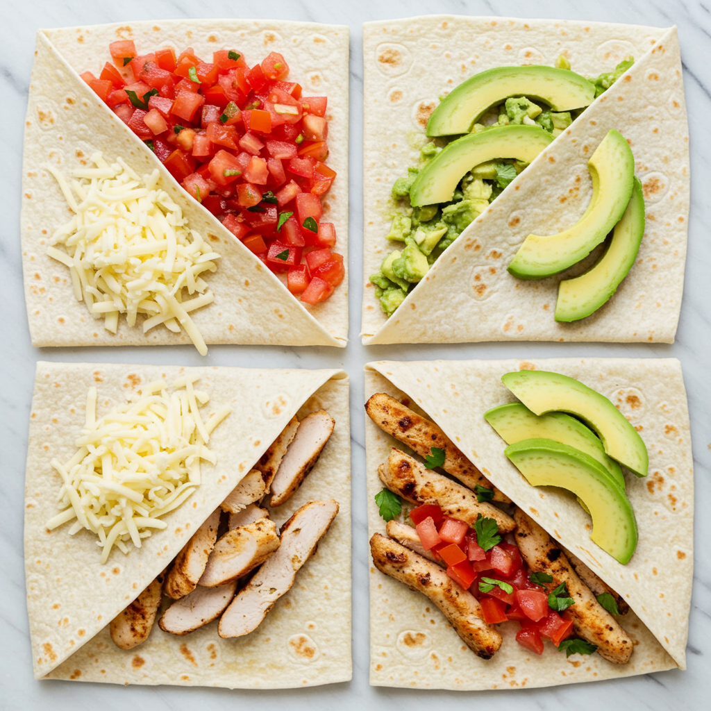 Consejo profesional: divide tu tortilla en cuatro cuadrantes imaginarios: coloca diferentes ingredientes en cada sección y luego dóblalos sistemáticamente: el cuadrante de salsa y queso sobre el aguacate, dobla esta sección sobre el pollo y luego completa el wrap .