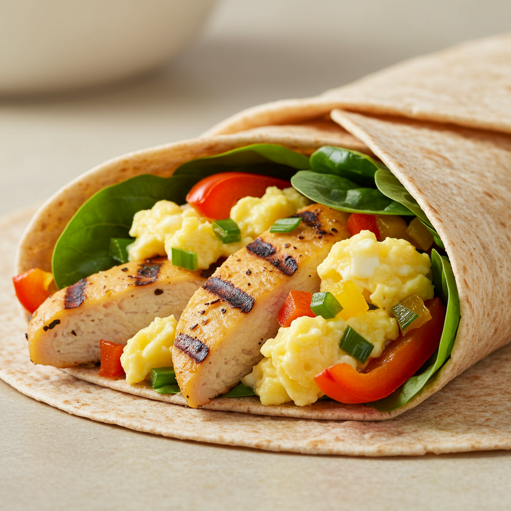 Calentar las tiras de pollo precocidas en una sartén. Revolver los huevos y sofreír los pimientos hasta que estén tiernos. Colocar una capa de tortilla caliente con espinacas, huevos, pimientos, pollo y queso. Agregar salsa al gusto y enrollar firmemente.