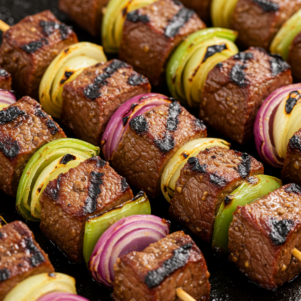 Estos kebabs llenos de sabor muestran el quinto sabor con una combinación de carne a la parrilla y varias cebollas que crean una profundidad increíble .