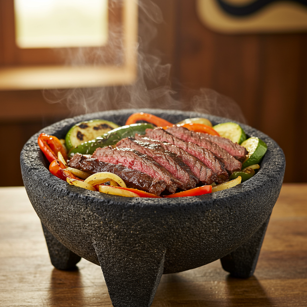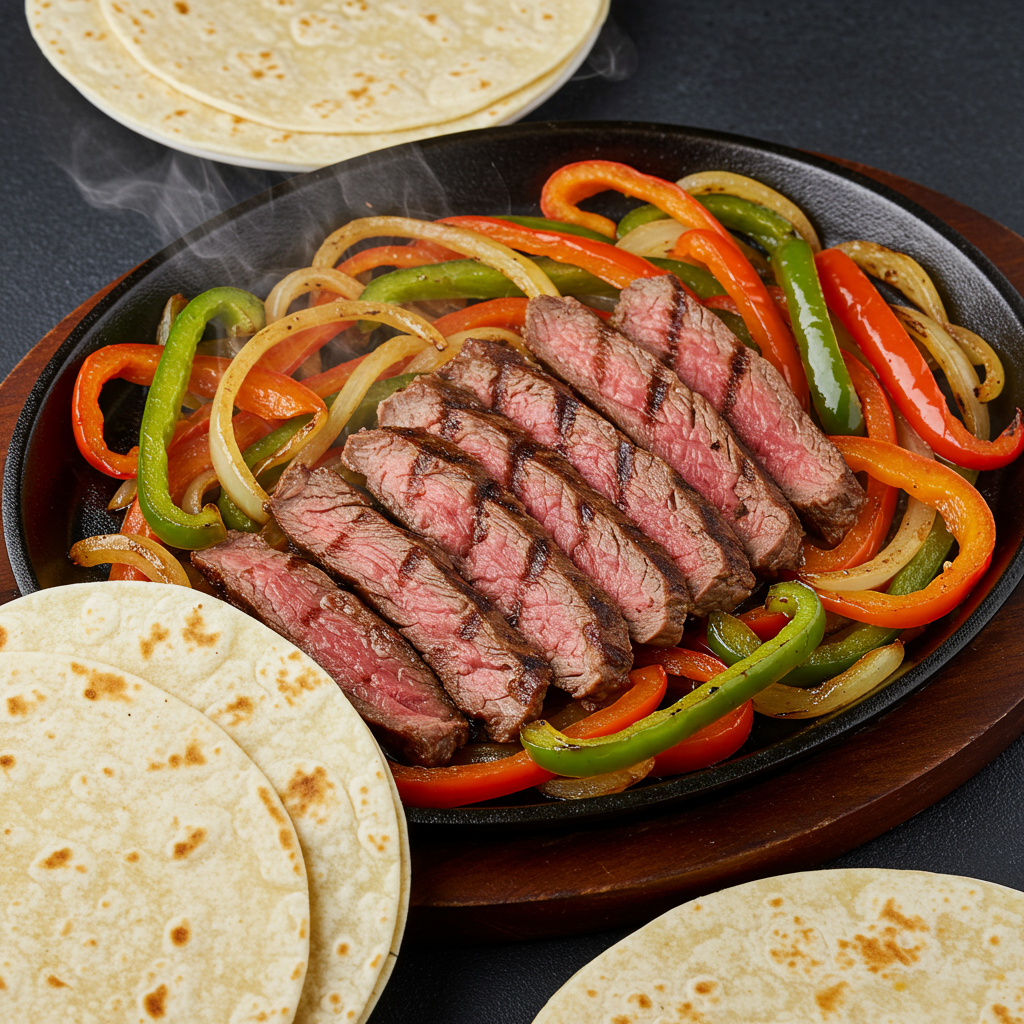 Cree una experiencia gastronómica interactiva con fajitas chisporroteantes con carne de res perfectamente asada y verduras coloridas .