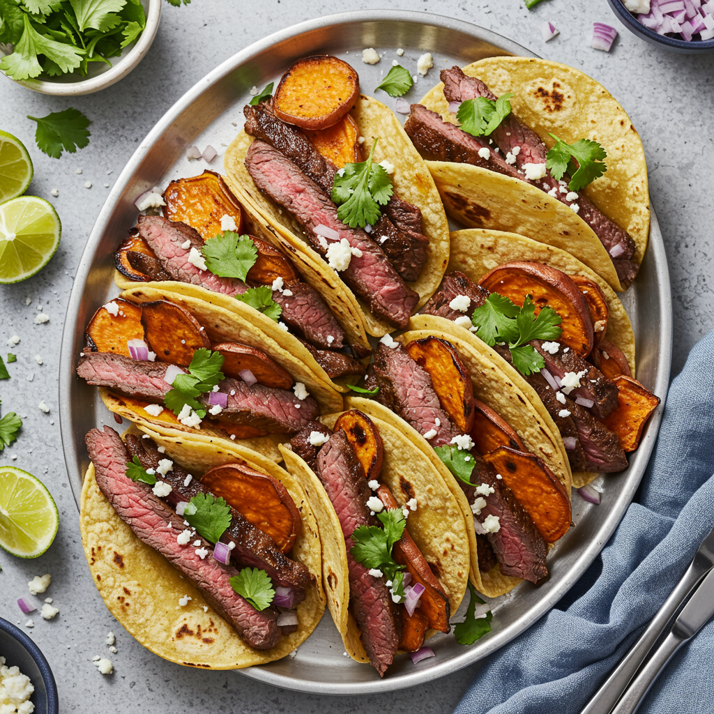 Estos tacos llenos de sabor combinan carne marinada con la dulzura natural de las batatas a la parrilla creando una comida equilibrada y nutritiva, perfecta para una cena informal .