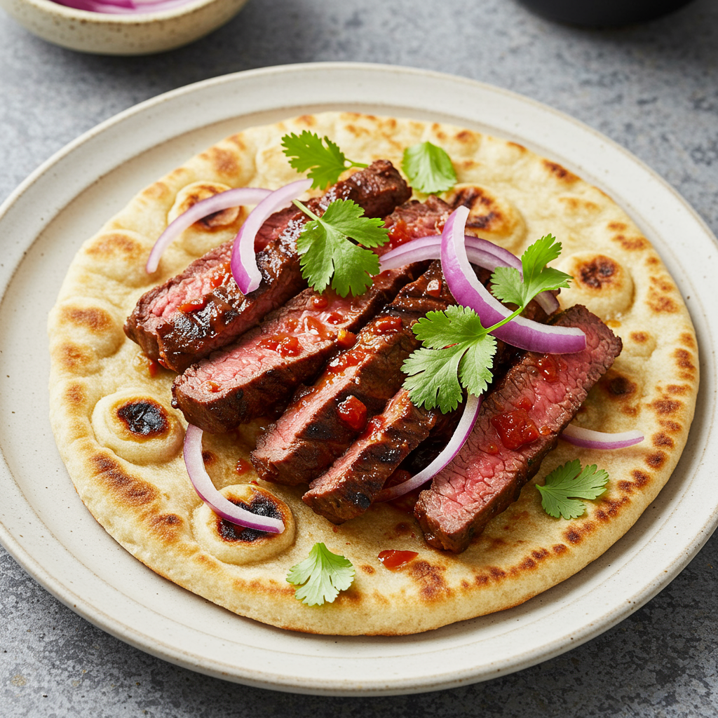 - Sirva el bistec sobre naan con cebolla roja, cilantro y gajos de lima.