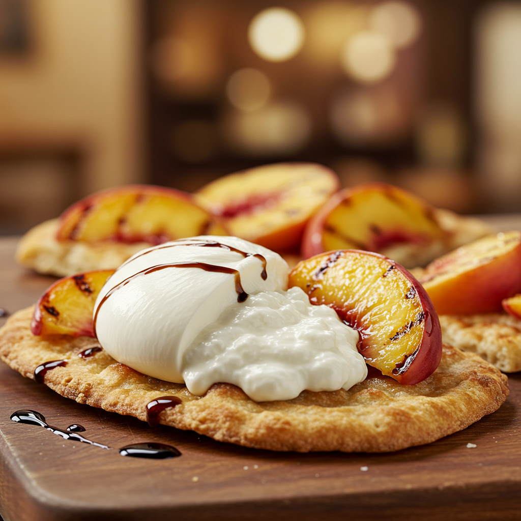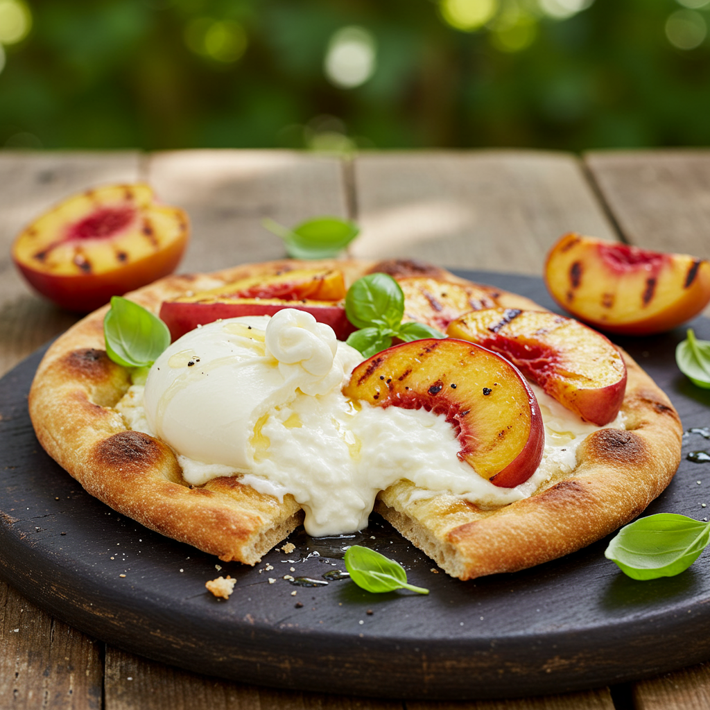 - Unta la burrata sobre pan plano y cúbrela con rodajas de melocotón.