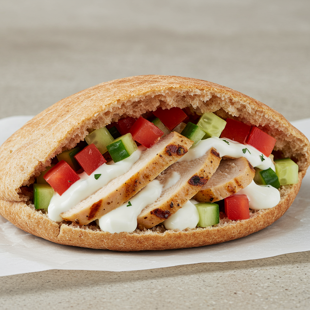 - Arma los wraps : Unta yogur griego sobre pan pita y luego coloca capas de pollo, pepino, tomate y cebolla.