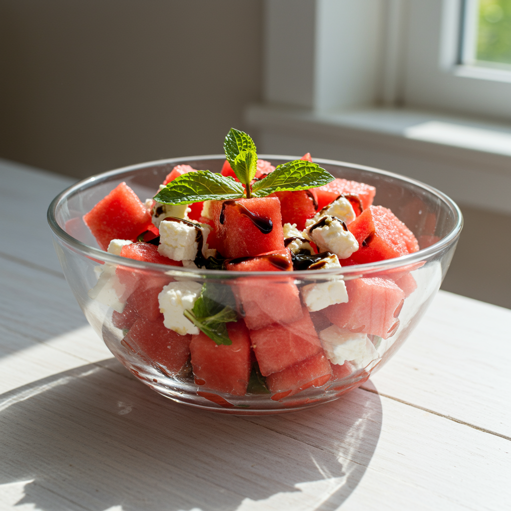 - Combine la sandía, el queso feta y la cebolla roja en un bol.