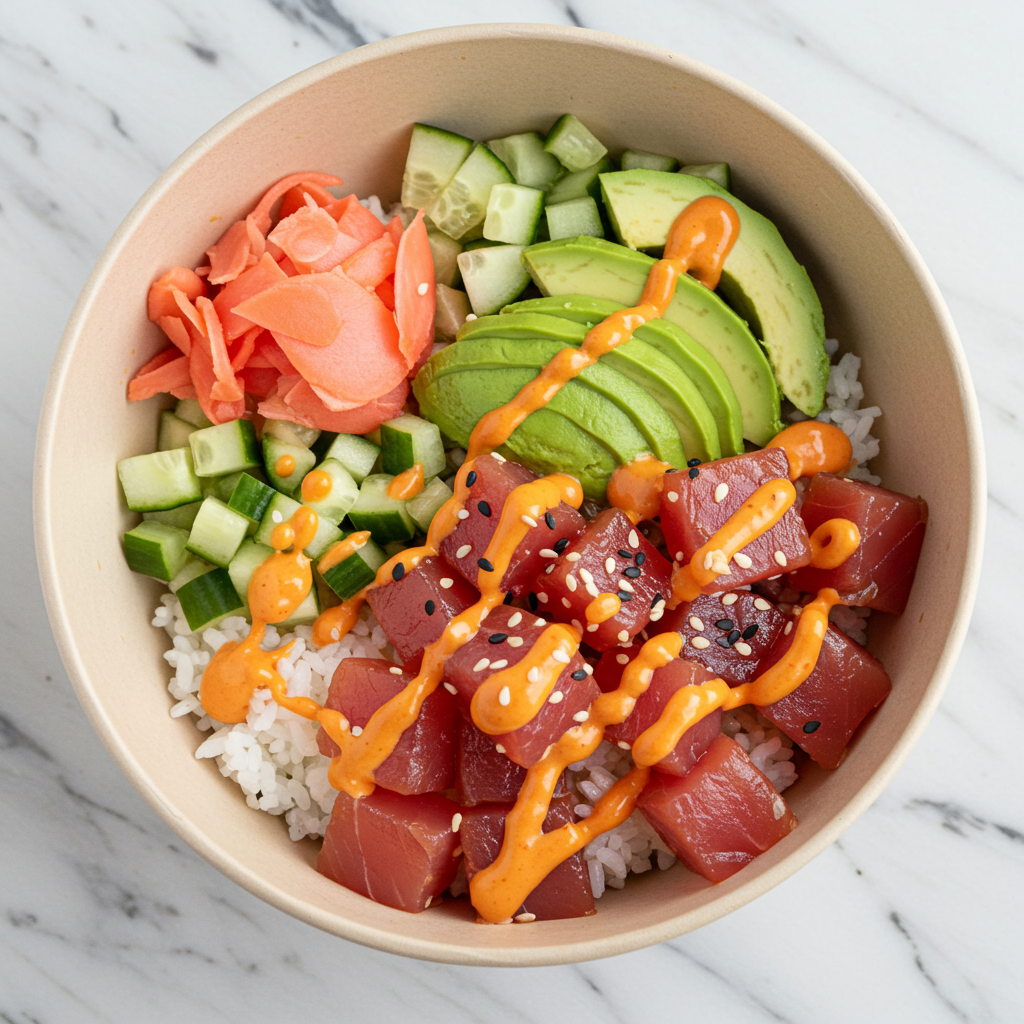 - Coloque el arroz en tazones y cubra con atún, aguacate y pepino.