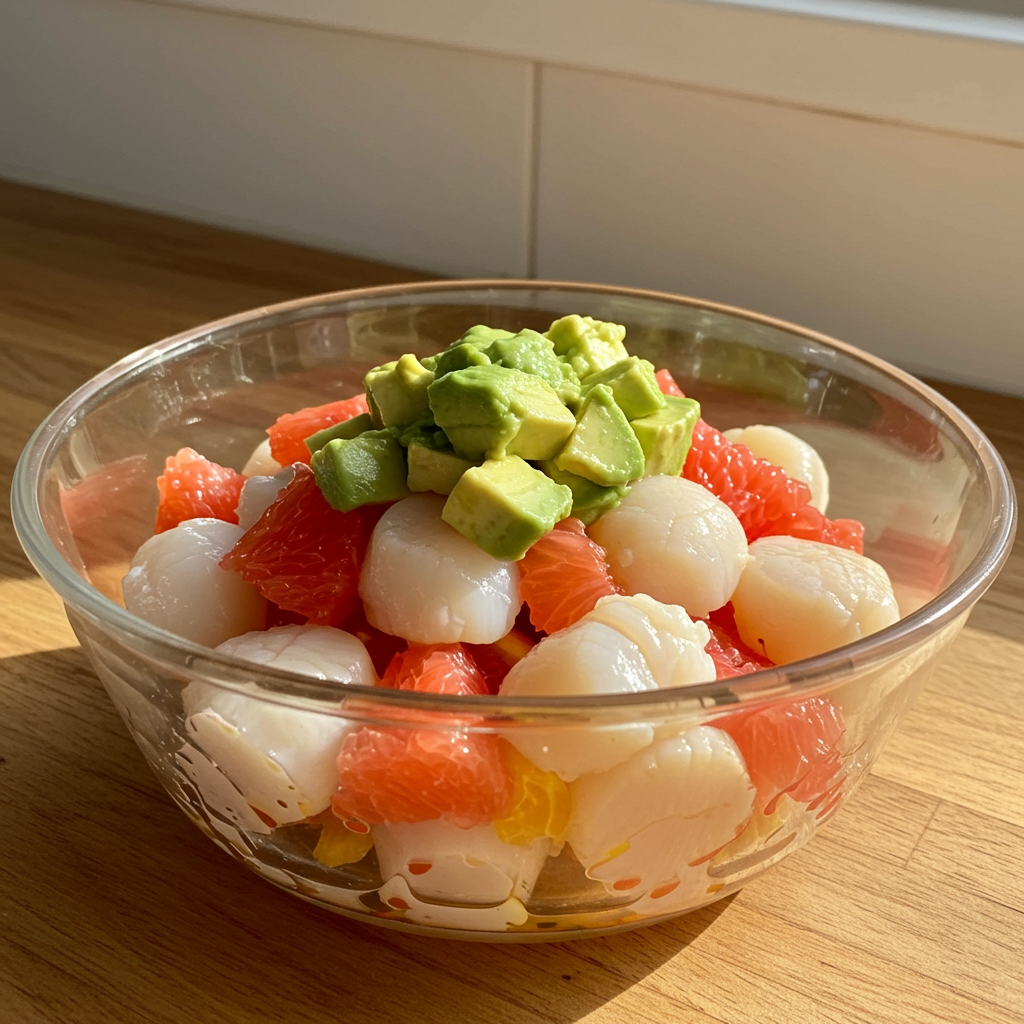 Un sorprendente plato sin cocción que combina vieiras dulces con brillantes sabores cítricos, perfecto para un refrescante aperitivo junto a la piscina.
